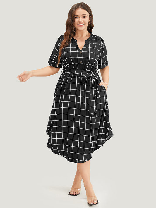 Plaid Pocket Arc Hem Button Up Belt Notched Dress