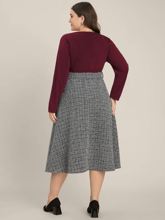 Plaid Patchwork Surplice Neck Belted Tweed Dress