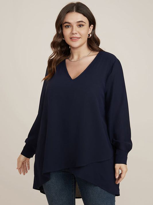 Solid V Neck High Low Hem Blouse