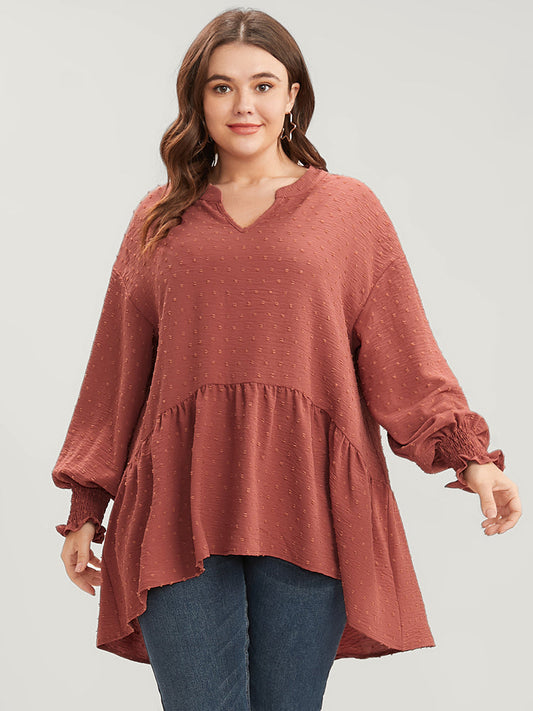 Polka Dot Lantern Sleeve Ruffles Shirred Asymmetrical Hem Blouse
