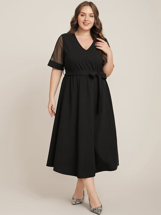 Plain V Neck Mesh Patchwork Pocket Belted Dress