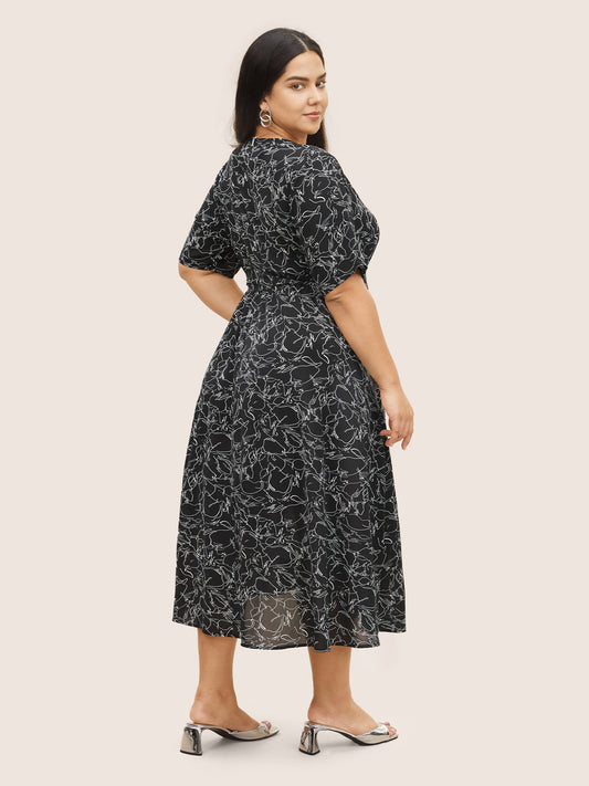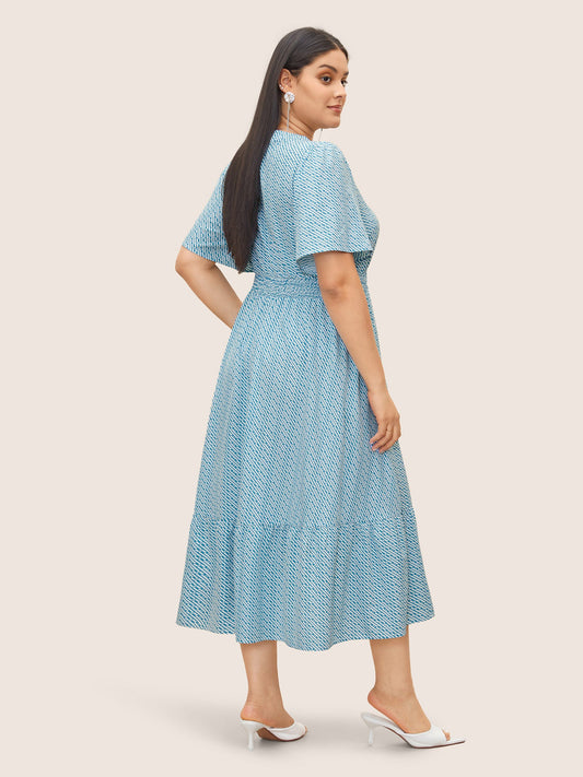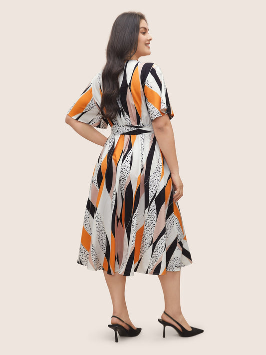 Geometric Contrast Overlap Collar Belted Ruffle Sleeve Dress