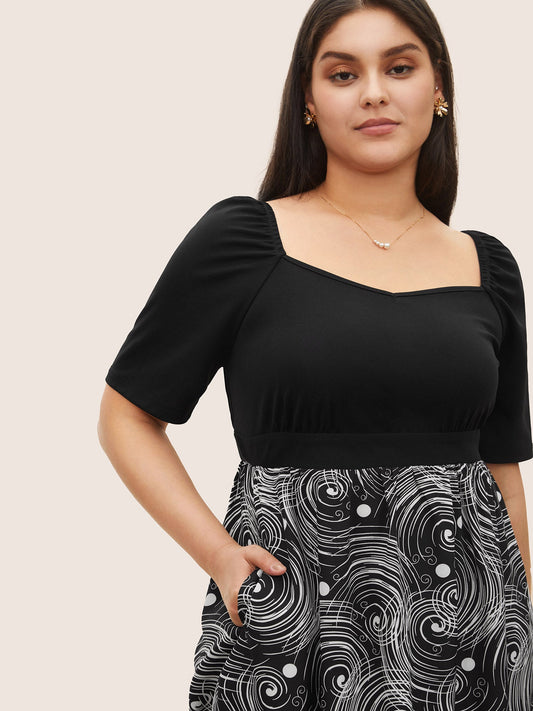 Geometric Patchwork Shirred Flat Collar With V Notch Dress