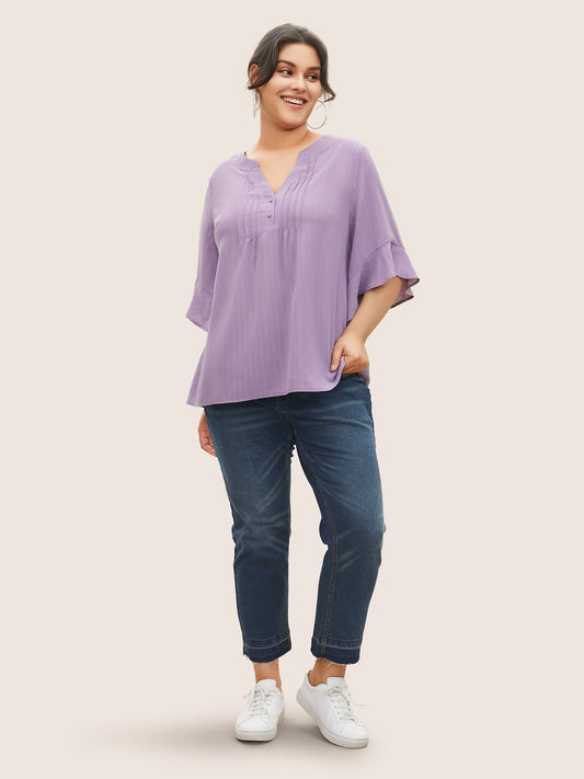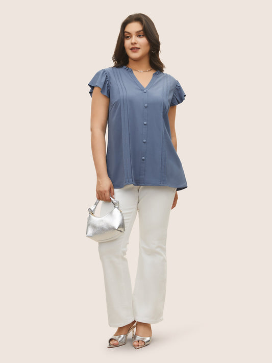 Plain Tucked Seam Button Up Flutter Sleeve Blouse