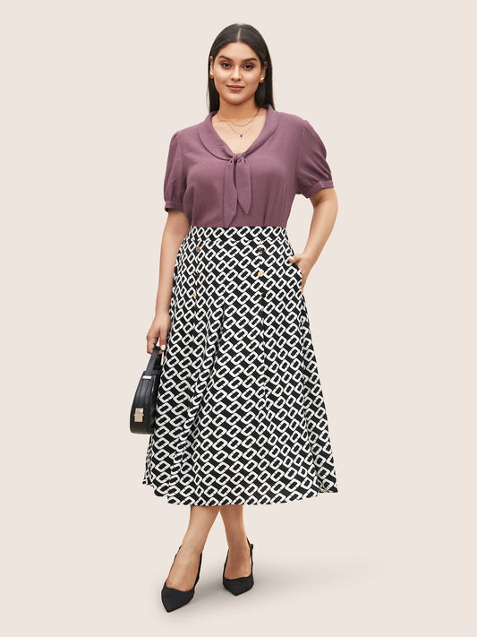 Solid Pocket Tie Neck Lantern Sleeve Belted Arc Hem Dress
