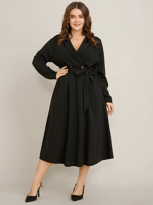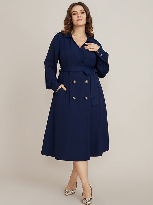 Solid Button Detail Pocket Belted Surplice Neck Dress