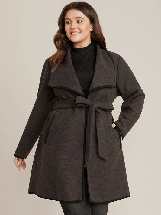 Contrast Trim Pocket Belted Lapel Collar Coat
