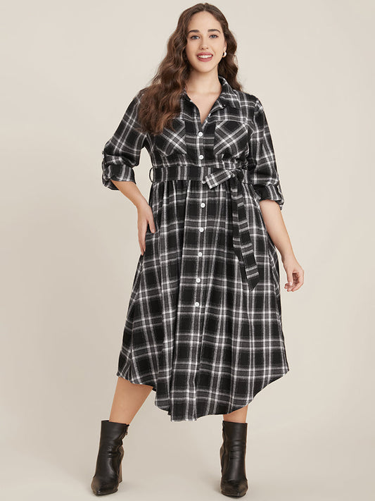 Plaid Pocket Button Cuffed Sleeve Belted Arc Hem Dress