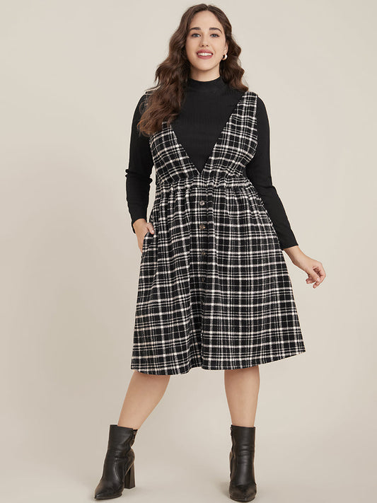 Plaid Sleeveless Pocket Button Detail Suspender Dress Without Sweater
