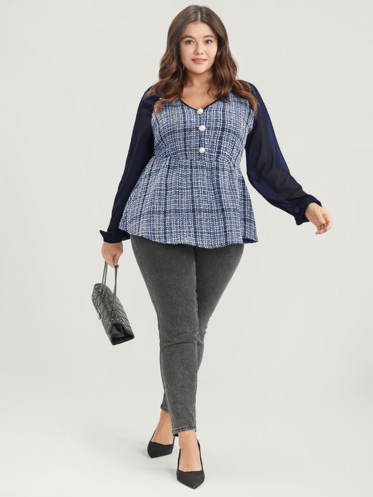 Plaid Patchwork Fake Button Lantern Sleeve Tweed Blouse