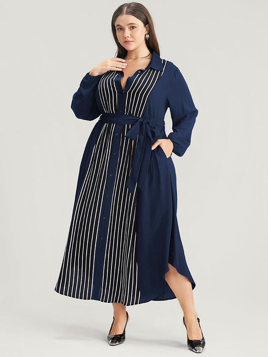 Striped Contrast Pocket Button Detail Belted Dress