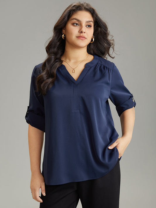 Static-Free Solid Gathered Tab Sleeve Blouse
