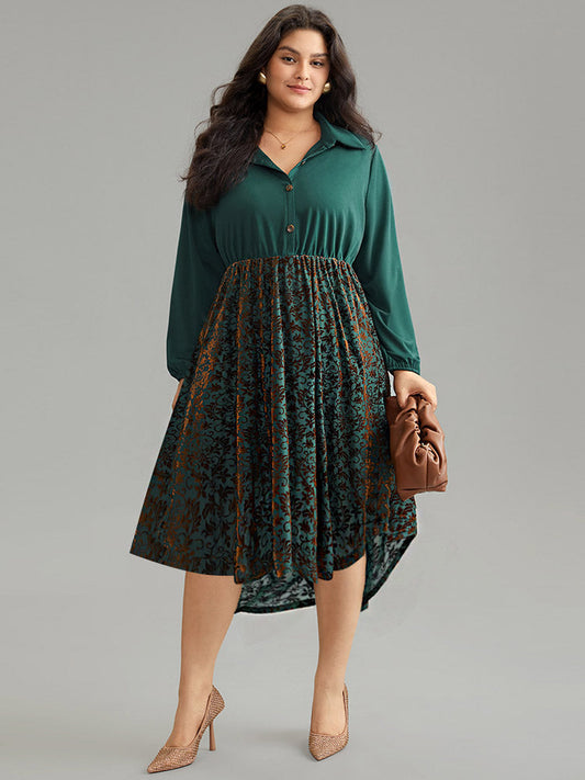 Silhouette Floral Print Velvet Shirt Collar Arc Hem Dress