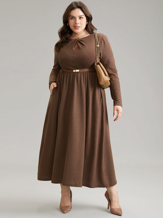 Anti-Wrinkle Solid Belted Pleated Keyhole Dress