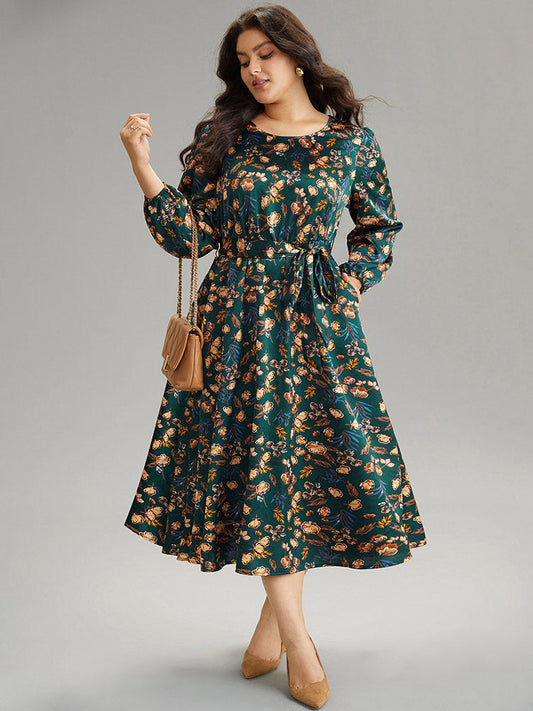 Floral Lantern Sleeve Belted Elastic Waist Dress