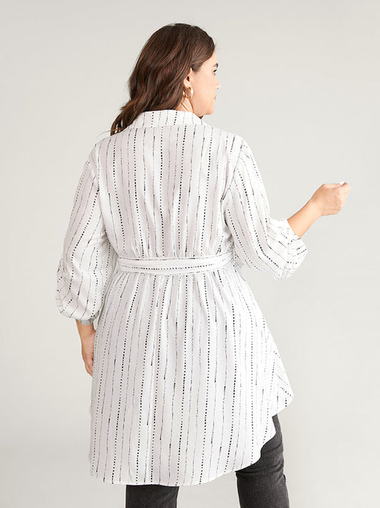 Striped Belted Shirt Collar Asymmetrical Hem Blouse