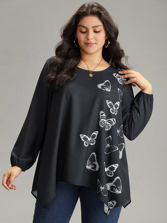 Butterfly Crew Neck Lantern Sleeve Hanky Hem Blouse