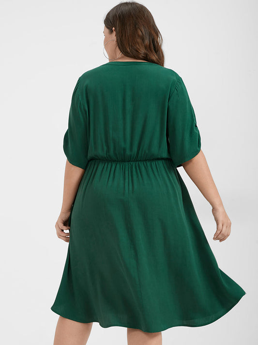 Solid Cuffed Button Sleeve Ruffles Zipper Knee Dress