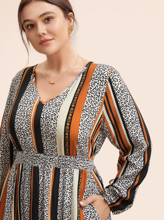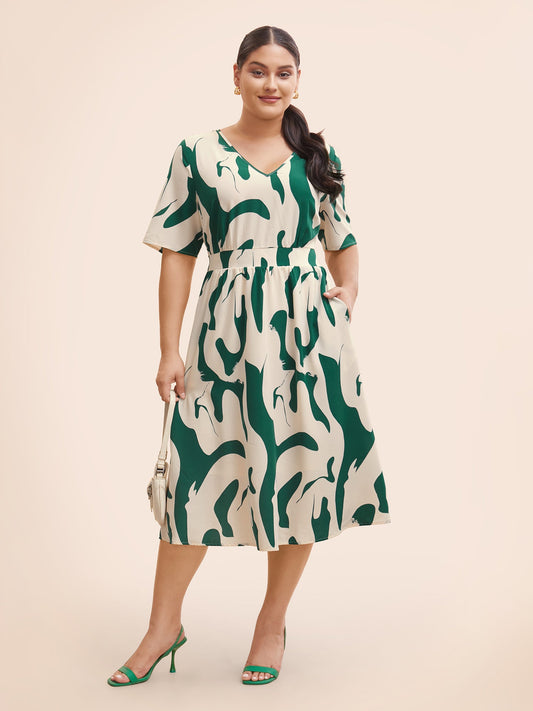 V Neck Geometric Shirred Midi Dress