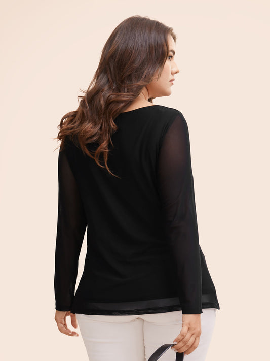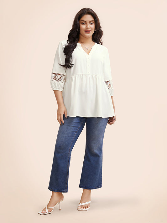Notched Patchwork Cut Out Lantern Sleeve Blouse