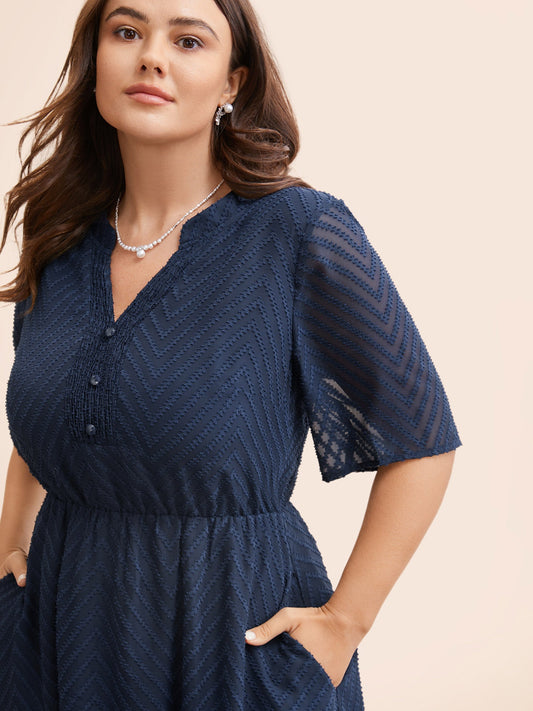 Texture Shirred Button Detail Midi Dress