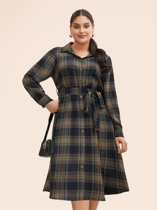 Plaid Shirt Collar Belted Midi Dress