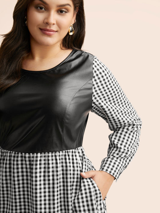 Round Neck Gingham PU Leather Dress