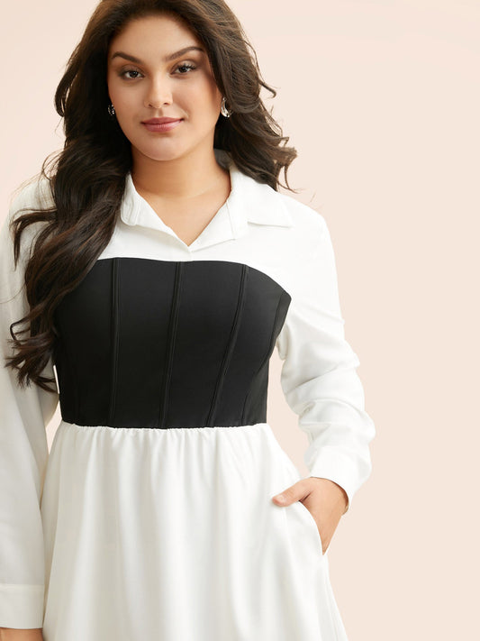 Colorblock Contrast Notched Lantern Sleeve Dress