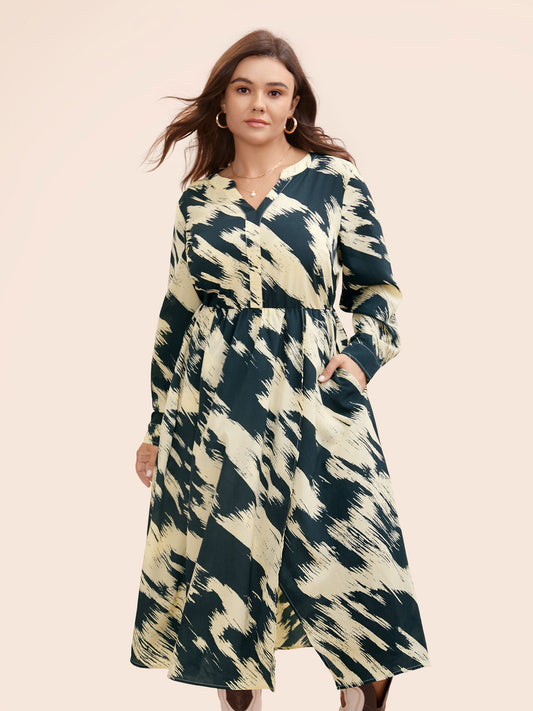 Brush Print Notched Collar Midi Dress