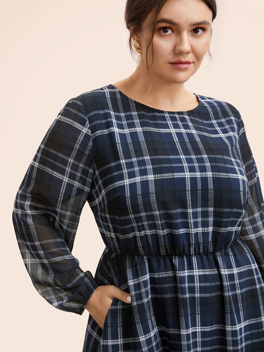 Plaid Round Neck Lantern Sleeve Dress