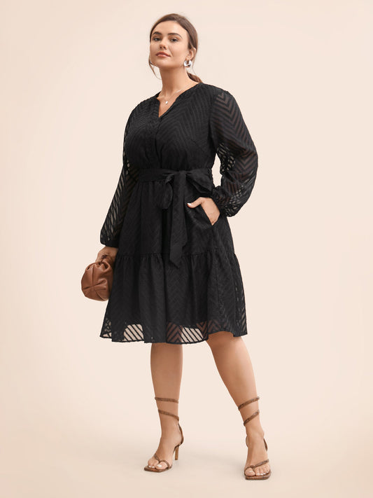 Textured Mesh Ruffle Hem Puff Sleeve Dress