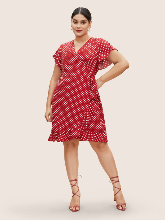 Polka Dot Wrap Ruffle Sleeve Tie Knot Dress