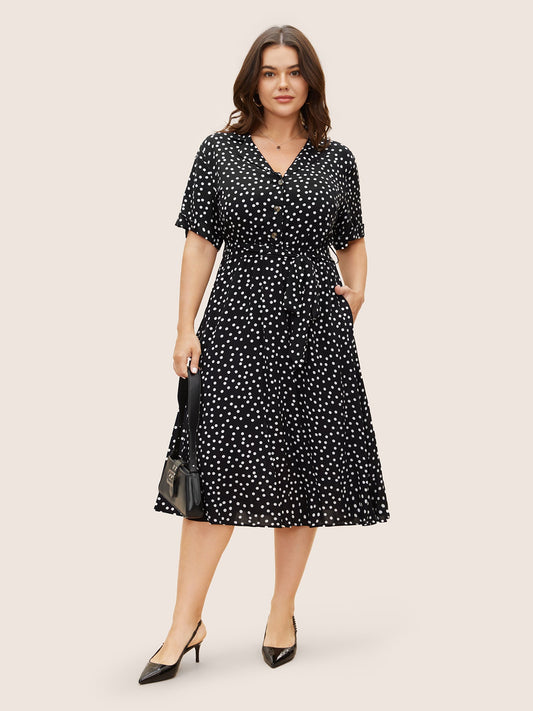 Polka Dot Suit Collar Cuffed Sleeve Dress