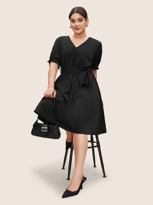 Solid Lace Panel Frill Trim Belted Dress