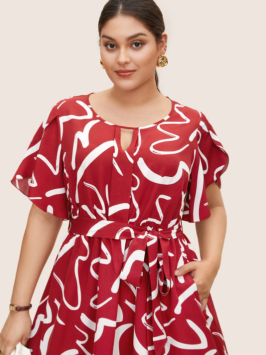 Graffiti Print Keyhole Petal Sleeve Dress