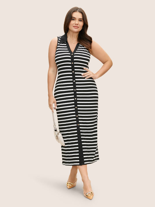 Lapel Collar Striped Button Detail Midi Dress