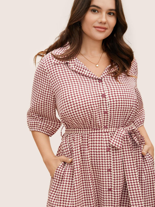 Shirt Collar Geometric Lantern Sleeve Belted Dress