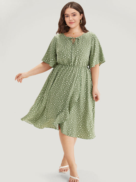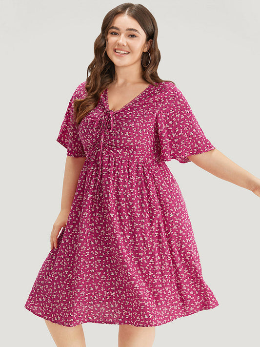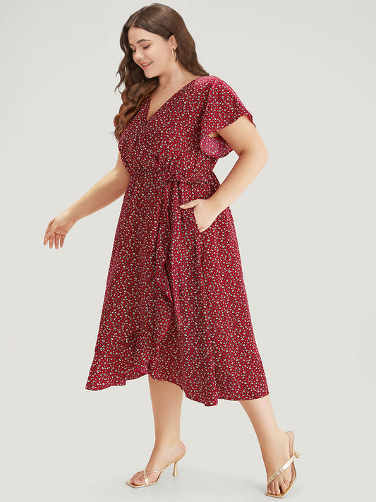 Ditsy Floral Overlap Collar Bowknot Flutter Hem Dress