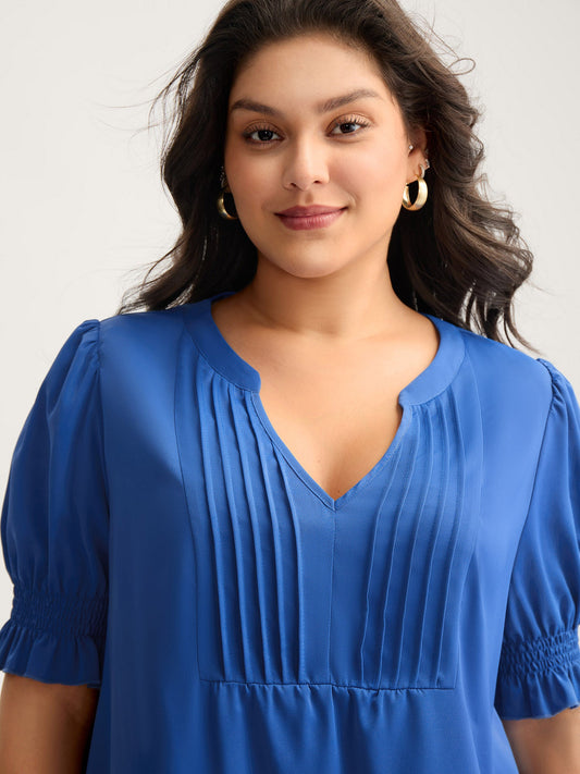 Shirred Cuffs Pintuck Pleats Solid Blouse