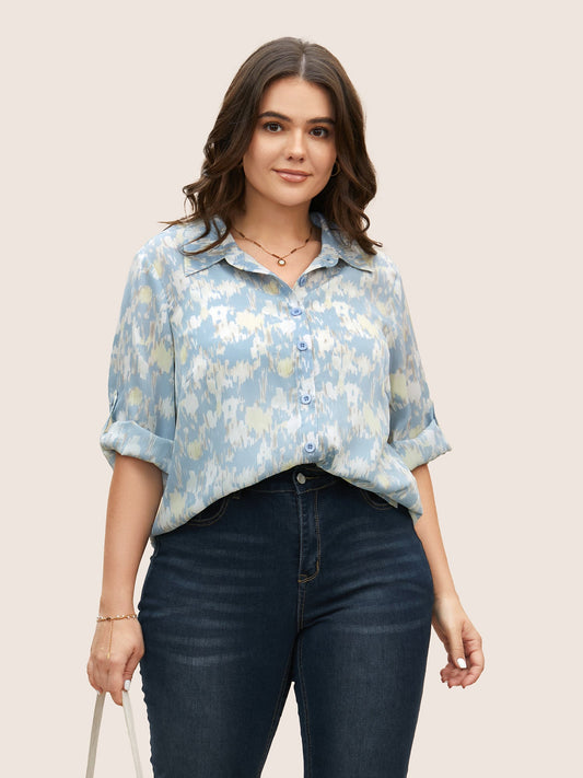 Shirt Collar Brush Print Tab Sleeve Blouse