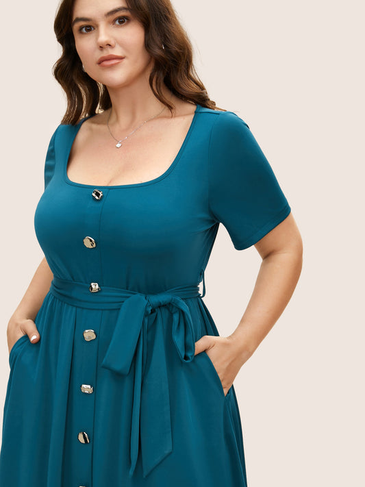 Square Neck Button Detail Belted Dress