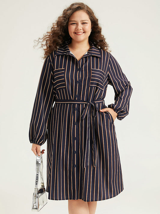 Striped Belted Lantern Sleeve Button Through Dress