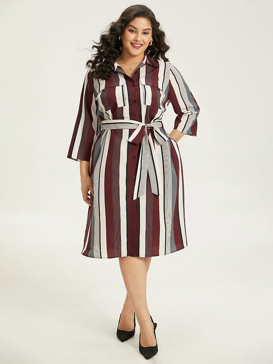 Striped Contrast Pocket Button Through Belted Shirt Collar Dress