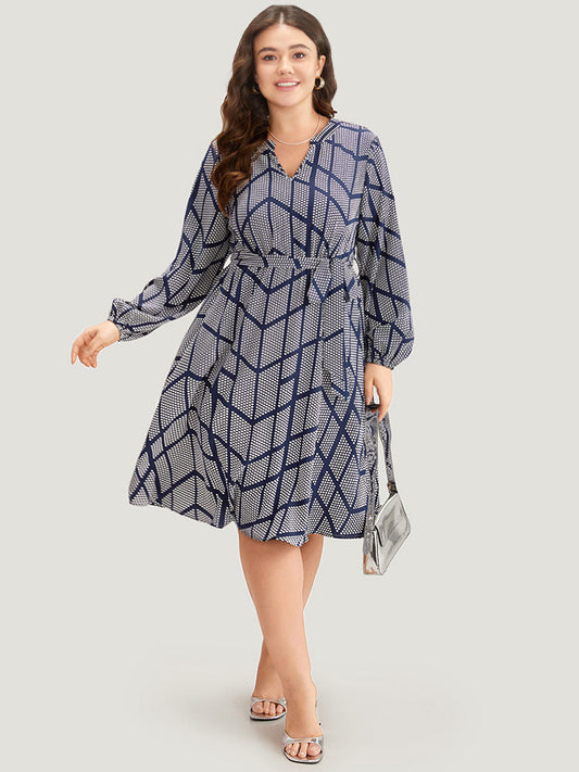 Polka Dot Geometric Belted Lantern Sleeve Dress