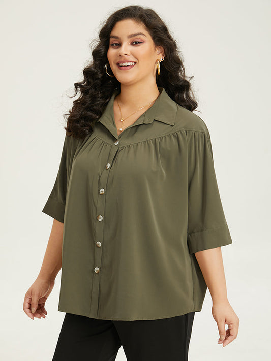 Shirred Belted Pocket Shirt Collar Button Through Dress