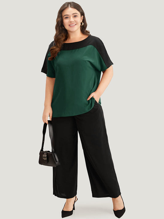 Anti-Wrinkle Two Tone Dolman Sleeve Woven Top