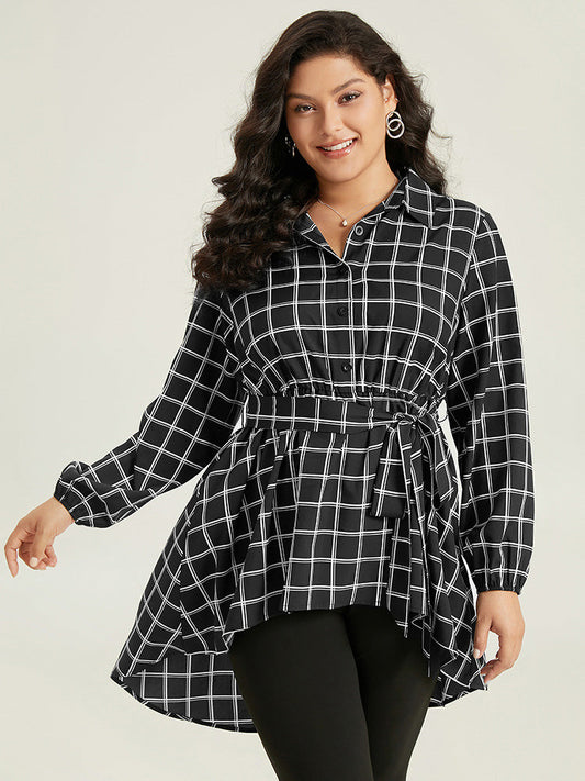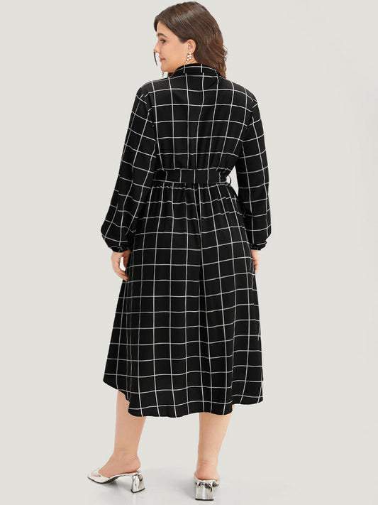 Plaid Shirt Collar Belted Lantern Sleeve Dress