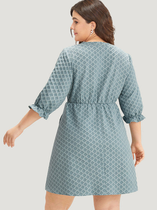 Geo Plisse Pocket Lantern Sleeve Notched Dress