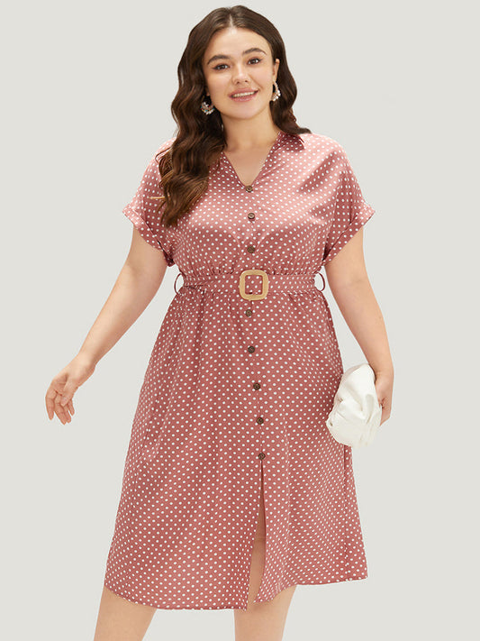 Polka Dot Metal Buckle Belt Button Detail Dress