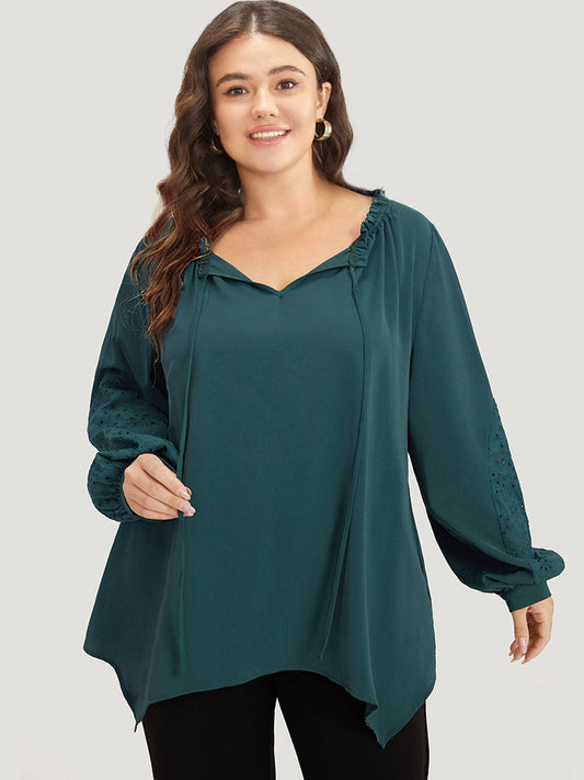 Anti-Wrinkle Broderie Anglaise Knot Neck Frill Trim Lantern Sleeve Blouse